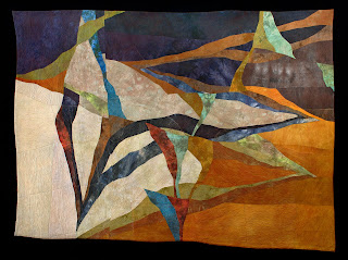 Jean added the tree snags, quilted her pieces, finished them with art facings and returned the panels to Patty. Patty finished the paintings and took the peices to a framer. The quilts hang free from the top and the paintings are stretched over frames that are about 3/4" in width. A dimensional feeling is created when you look at the piece.